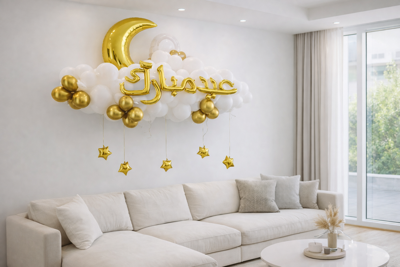 Celebrate Eid in style with our luxury Eid Mubarak Balloon Cloud Decor, designed to create a magical focal point in any living room or event space. This elegant installation features a handcrafted white balloon cloud, metallic gold crescent moon, mini balloon clusters, and hanging star balloons, finished with gold Arabic āEid Mubarakā letters.