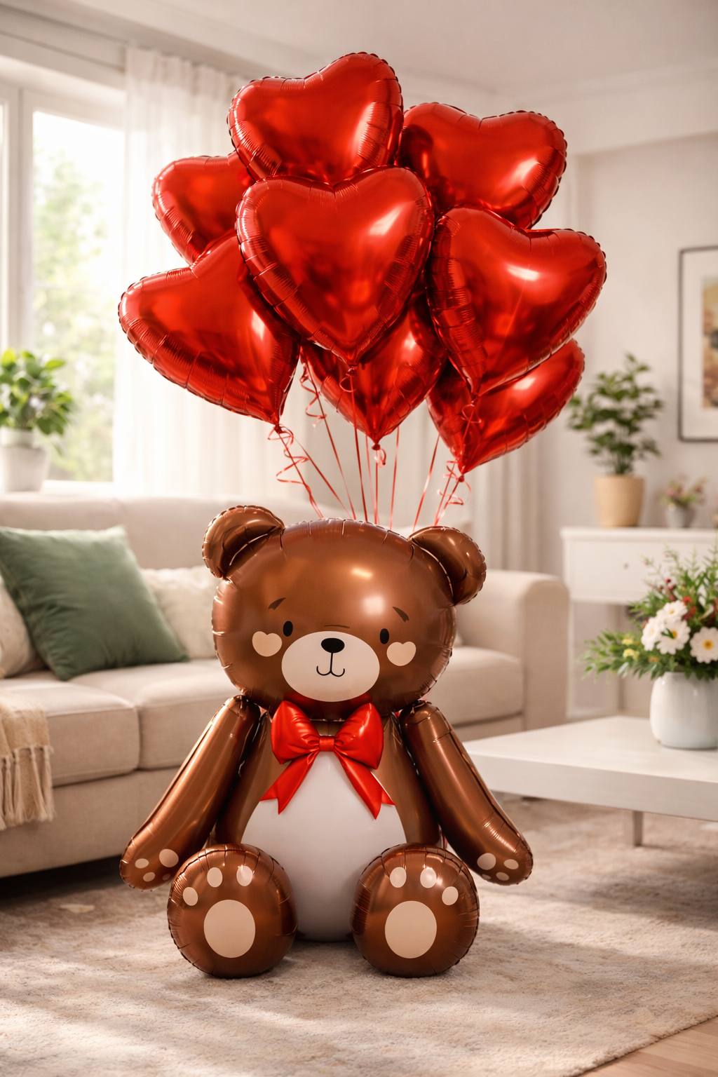 Valentine’s Teddy Bear Balloon Bouquet, a charming romantic gift that combines love, cuteness, and celebration all in one. This arrangement features a lovable teddy bear balloon base topped with a cluster of shiny red heart balloons — perfect for Valentine’s Day, anniversaries, surprises, or romantic gestures.