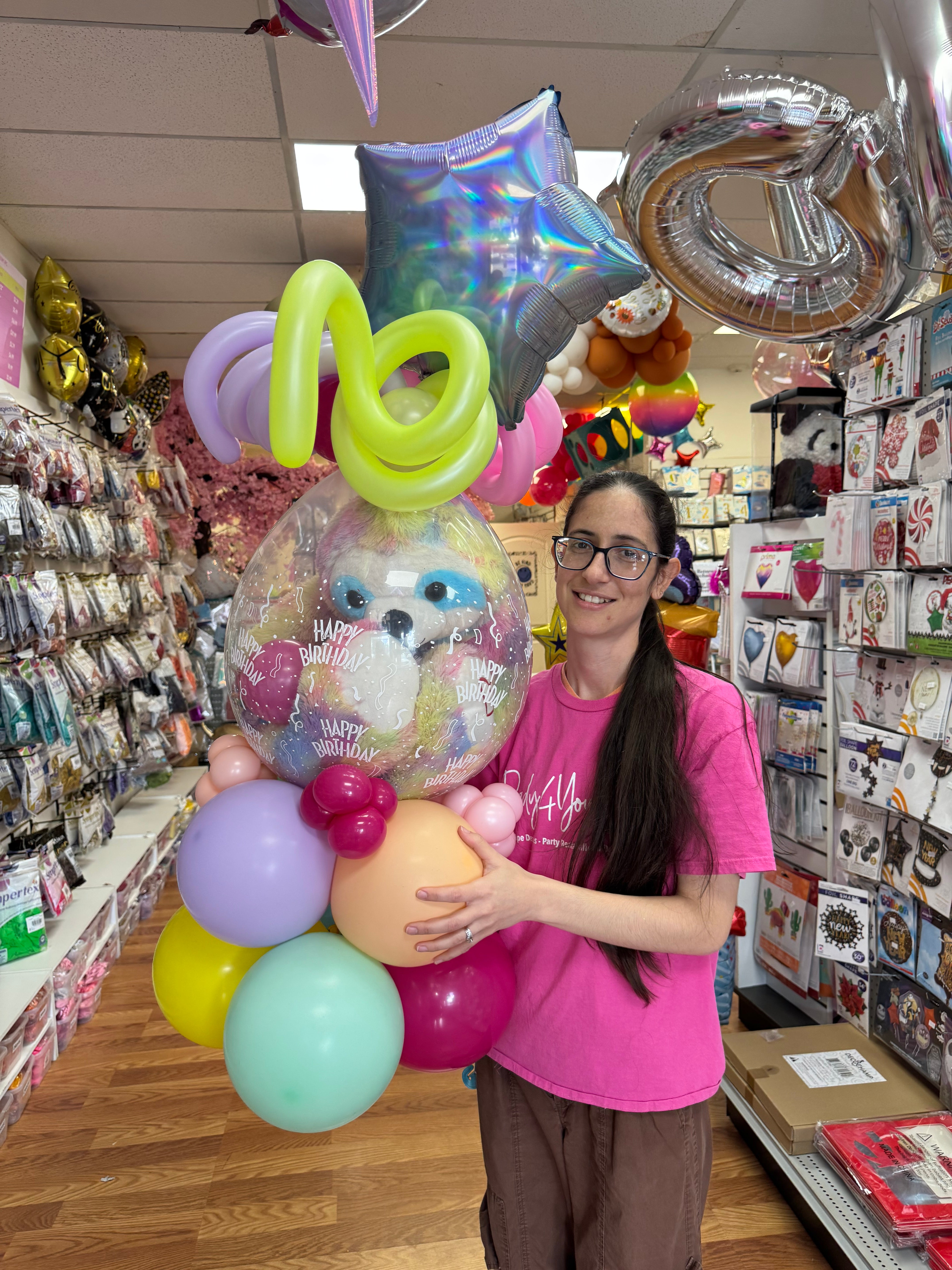 Each one comes with a stuffed animal, candy, and a balloon topper that can be personalized with a name.
