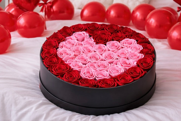 Make a lasting impression with our luxury preserved rose heart box. Designed with 52 premium preserved roses, this elegant arrangement requires no water or maintenance and can last up to 3 years with proper care.