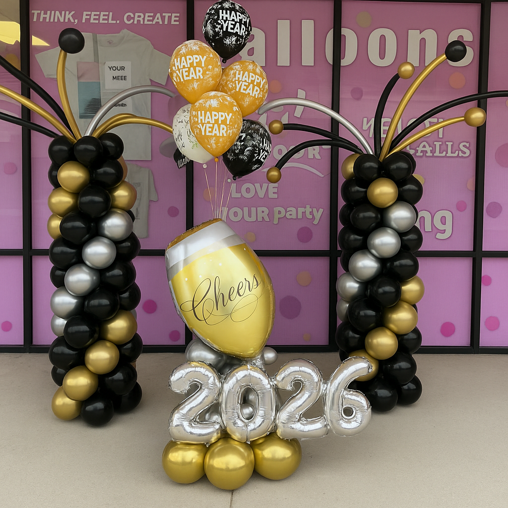 • 1 “Cheers 2026” Balloon Décor Piece with champagne glass